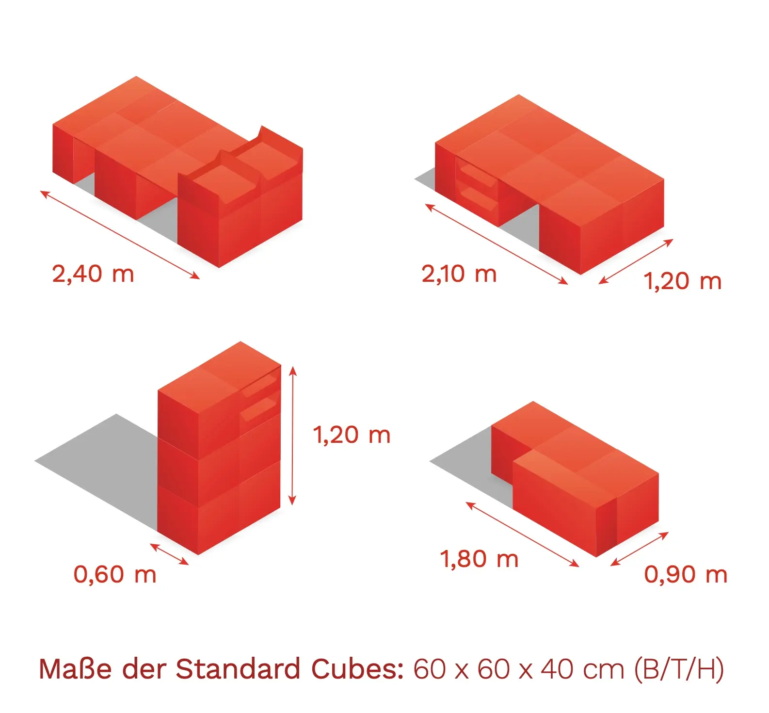 Wir zeigen dir verschiedene Kombinationsmöglichkeiten, aber deiner Kreativität sind keine Grenzen gesetzt. Die Cubes haben alle die gleichen Maße (ausser Bank und Ablage) und können neben- und aufeinander gestapelt werden.